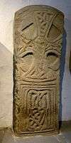 A disc-headed sculptured cross, with an inscription which fills the cross stem. First mentioned in 1697, it was in Margam Abbey Churchyard, south of the Church, until it was moved into the museum.[11] It is 1.01 metres (3.3 ft)high, 0.48 metres (1.6 ft) wide and 0.3 metres (0.98 ft) thick, made from locally occurring Pennant sandstone.[11] The cross head is 0.44 metres (1.4 ft) in diameter. It is made from a single piece of Pennant sandstone, although a thin tenon on its base suggests it was made to fit into a pedestal socket.[11] Stylistically the splayed arms and wide circular armpits are similar to 10th-century crosses from the north of England.[11]