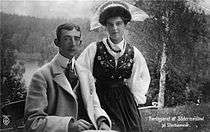 After a honeymoon in Germany, Italy and France, the newlyweds went to Sweden, where an official ceremonial reception awaited them with the state flags of Russia and Sweden waving in Stockholm.[3] In the beginning, the marriage looked successful. The couple set up their home in the Swedish country side in the province of Södermanland.[19] They spent the summer there, returning in October to Stockholm.[19] Maria added Swedish to the other five languages she spoke, and became popular in her new country. The Swedes felt she worked harder than her husband did. She was well liked by her father-in-law Gustaf V, who appreciated her "effervescence, charm, and unconventionality."[20] Maria Pavlovna, known in Sweden as the Duchess of Södermanland, was pregnant by the fall, but she quickly realized that she had little in common with her husband. Their relationship was cold. She had little interest in him and he on her. The couple's only child was born on 8 May 1909.[21] He was Prince Lennart, Duke of Småland, later Count of Wisborg (1909–2004)