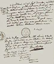 Marie-Aurore wrote to her friend, François Robin de Scévole about the death of Maurice. The most touching correspondence of a mother who has just lost her only son, a few days after the disappearance of her little grandson. The emotion and distress of Marie-Aurore is such that the letter written in the château de Nohant was wrongfully dated 12 September 1808, when Maurice died on 16 September. At the end of the page, Marie-Aurore's tears leave traces visible even today.[32] Her seal in the header of the letter, is black:[33]