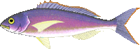 Brown to reddish purple on upper part, colour is less pronounced below. Blue spots on snout. Dorsal and caudal fins are fringed with yellow and orange. | Found in mid waters above rocky bottoms. Swims up at night to feed on small fishes and crustaceans. Caught with line. | Carnivorous | 50 cm. | Good commercial fish. |