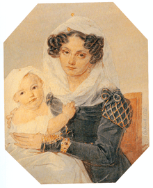 Princess Maria Nikolaevna Volkonskaya (née Raevskaya; Russian: Мария Николаевна Волконская (Раевская); December 25, 1805 – August 10, 1863) was the youngest daughter of the Russian general Nikolay Raevsky and Sophia Konstantinova, granddaughter of Mikhail Lomonosov. In 1825 Maria married the future Decembrist Major General Prince Sergey Grigorievich Volkonsky. When Volkonsky was arrested and exiled to Siberia, she followed him into exile on the condition that her children born after her departure to Siberia would be forever struck from the noble estate and become bonded laborers (Russian: заводские крестьяне); the threat, however, was not put into practice.