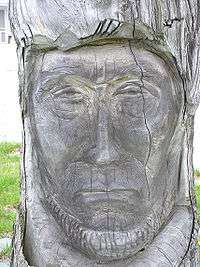 A tree trunk carved in the likeness of Marlboro Packard, this tree is found on the grounds of his home in Searsport, Maine. | |