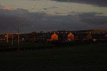 High Marley Hill stands on the brow of the hill to the west of the village, about halfway between Byermoor and Marley Hill itself. It consists of three cottages beside the road, a large house which is accessed via School House Lane, Longfield Farm, a pallet works which occupies the former High Marley Hill School buildings, and several buildings surrounding a large radio antenna, which sits on top of Blackamoor Hill. There was an anti-aircraft battery near High Marley Hill during World War II, and a drift mine which closed in the 1960s, as did the nearby Byermoor Colliery.[18] The 1951 OS map shows an opencast mine in the field beside the road, near the farm (marked on the map as Longfield House) and there is an embankment which runs parallel to School House Lane, from the site of the drift to the remains of a large retaining wall. This was presumably a loading point on the Bowes Railway, the trackbed of which is still visible, running alongside St. Cuthbert's Road. The presence of a large flat area of waste ground on the opposite side of the road to the wall is a possible indication there were railway sidings here. It is not known whether this loading point also handled the output of the opencast. The 1951 map also shows a terrace called Waggonway Row just beside the retaining wall. The outline of these houses can be seen from the air and is visible on Google Maps. The large house on School House Lane has several outbuildings which appear to have been associated with the drift. This theory would explain the presence of a sign on the wall of the building nearest the road which reads "UK Coal Monitoring Station." Exactly what this is monitoring is unclear, although it is likely to be mine water or gas. School House Lane forms the southern end of St. Cuthbert's Road, and vehicular access beyond the large house is prevented by a large concrete block which has been placed in the centre of the lane.