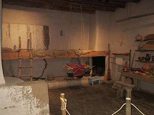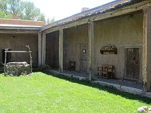 Don Antonio Severino Martinez, also known as Severino Martinez, bought the property about 2 miles southwest of the Taos Plaza in 1804,[3] after relocating his family from Abiquiu to Taos that year.[4][nb 1] At first the building was a four-room dwelling and then it grew as Martinez became more successful.[7] It was made of thick adobe walls, without exterior windows. The hacienda had 2 inner courtyards, or placitas, around which a total of 21 rooms were built. It was constructed as a fortress for protection against attacks by Plains tribes,[3][8][nb 2] such as Comanche and Apache raiders. When there was a threat of violence, the livestock were brought into the courtyards of the hacienda for safety.[10]
