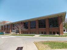 The Davenport architectural firm of Charles Richardson Associates designed the building that was built by Priester Construction in 1973 for $1.9 million.[3] The 103-by-71-foot (31 by 22 m), three-story structure follows a rectangular plan. There is a single-story lecture hall-auditorium that is attached to the west side of the building on the basement level. The exterior walls are composed of reinforced concrete and are partially faced with reddish-brown brick that is laid in a running bond. Both the north and south elevations are divided into seven bays and the east and west elevations are divided into three bays. The most dominate feature is the building's third floor that cantilevers around the entire perimeter of the structure. It is supported by square, pre-cast concrete columns. The building reflects the influence of the Miesian and New Formalism architectural styles.[3] The widows on the first and second floor are panels of tinted glass, with vertical window pairs on the third floor. Matching entrances are located in the center bay on the north and south elevations. The building housed a television studio and control room, lecture halls, offices, classrooms, a student lounge, study rooms, a laboratory, faculty lounge, media workroom and conference rooms.