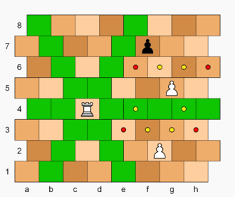 The Masonic board cells are slightly rectangular, and indentation of alternating ranks results in cants (oblique files) 30 degrees from the vertical and diagonals 30 degrees from the horizontal, the same as hexagon-based chessboards when cell vertices face the players. (For example, rooks have six directions of movement, and Masonic pawns move and capture the same as pawns in De Vasa's hexagonal chess. Masonic bishops, however, are limited to the four diagonal directions to the sides.) As with hex-based boards, three colors are used, so no two adjacent cells are the same color, and gameboard diagonals are highlighted.