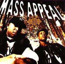 "Mass Appeal" is a song by American hip hop group Gang Starr from the album Hard to Earn. The song reached #67 on the Billboard Hot 100 and #42 on the Billboard R&B chart.[1] It was also featured on the soundtrack of the video game Tony Hawk's Pro Skater 4.[2]