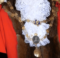 The ceremonial dress of the Mayor includes a crimson fur lined robe, a cocked hat, white gloves, and the Mayor's Chain of Office, made in 1893, from which hangs a miniature portrait of Hugh Squier (died 1710), the town's "great benefactor".[1] Kelly's Directory of Devon reported in 1902:[4]