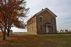 The Maysville Schoolhouse is a historic building located south of Hampton, Iowa, United States. The former school building is the only structure left from the defunct town of Maysville, the first town established in Franklin County.[2] It was platted in 1865, and it was located on the stage line between Ackley and Hampton. Many merchants and professional moved into the community. This two-story, vernacular stone structure was built for $5,000 in 1867 by James Carn as a combination schoolhouse and meeting hall. The citizens of Maysville hoped that their community would be chosen as the county seat, but in 1872 the railroad went north to Hampton. In the 1880s the businessmen and professionals moved out, and the post office closed in 1890. By the turn of the 20th-century Maysville had become a ghost town. The school remained in operation until 1957, but the second floor hall continued to be used by various community organizations and the Methodist Church. The building was listed on the National Register of Historic Places in 1981.[1]