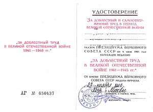 Attestion of award of the Medal "For Valiant Labour in the Great Patriotic War 1941–1945"