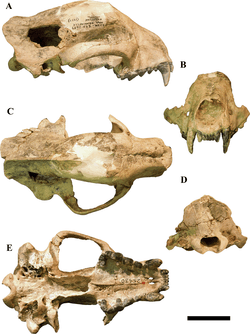 The genus Megalictis was first described by W. D. Matthew in 1907, and assigned to the family Mustelidae.[5] Two similar genera discovered at the same time, Aelurocyon (Peterson, 1907) and Paroligobunis (Peterson, 1910) were identified as synonymous with Megalictis in 1996[2] though Paroligobunis was re-established as a separate genus in 1998.[6] P. R. Bjork, in 1970, assigned the genus to the subfamily Mellivorinae,[7] whilst J. A. Baskin reassigned it to Oligobuninae in 1998.[5] Three species have been identified in the genus: M. ferox, M. petersoni, and M. frazieri, whilst two more, Megalictis brevifacies and Megalictis simplicidens, have since been determined to be synonymous with M. ferox. Other synonyms of M. ferox include Aelurocyon brevifacies, Brachypsalis simplicidens and Paroligobunis simplicidens.[5]