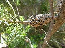 The flowers are arranged in cylindrical spikes that are 40–50 mm (1.6–2.0 in) long and wide. The spikes occur on old wood and there are 40 to 60 flowers on each spike. The stamens are arranged in five bundles around the flowers with 4 to 5 stamens per bundle, and are usually green in the centre grading to red at the tips. Flowering occurs over an extended period from July to October. The fruit are woody capsules in dense spikes 40–50 mm (1.6–2.0 in) along the stem long and each capsule is 4–5 mm (0.16–0.20 in) long and wide.[1][2]