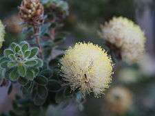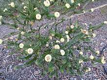 The flowers are arranged in hemispherical heads, mostly on the ends of branches which continue to grow after flowering. Papery brown, overlapping bracts surround the flower buds and remain under the open flowers. The filaments of the stamens are white but the anthers on their ends are yellow or cream coloured, giving the appearance of pale yellow flowers. The heads contain 4 to 12 groups of flowers in threes and are up to 50 mm (2 in) wide. The petals are 3–5 mm (0.1–0.2 in) long and fall off as the flower matures. The stamens are arranged in five bundles around the flower, each bundle usually containing 12 to 16 stamens. Flowering occurs from June to November but mainly in early spring and the fruit which follow are woody, cup shaped capsules 4.5–7 mm (0.2–0.3 in) long that are clustered along the stem.[1][2][3]