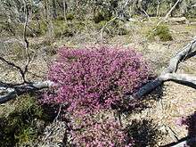 The flowers are a shade of pink to purple and are arranged in spikes on the ends of branches which continue to grow after flowering, and sometimes in the upper leaf axils. The spikes contain 2 to 9 groups of flowers in threes and are up to 10 mm (0.4 in) in diameter and 20 mm (0.8 in) long. The stamens are arranged in five bundles around the flowers and each bundle contains 2 to 5 (mostly 3) stamens. Flowering occurs between September and January and is followed by fruit which are woody capsules 2–2.5 mm (0.08–0.1 in) long in almost spherical clusters which are up to 10 mm (0.4 in) in diameter.[1][2][3]