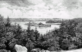 In August 1794, a French ship captured in St. Domingo arrived in Halifax.[21] A plan to house these prisoners in Halifax met with opposition from the citizenry because of a fear of "fever"; indeed, surgeon John Halliburton suggested that if the plan was carried out, "the popular would burn down [the housing] with the sick prisoners inside".[22] Halliburton rented Kavanagh's Island, likely on the suggestion of Governor John Wentworth, and by June 1795 had sent 70 sick and wounded prisoners to its makeshift prison hospital. The other prisoners were kept on the La Felix prison ship.[23] Sixteen soldiers of the Royal Nova Scotia Regiment acted as guards for the hospital beginning in 1796.[4] Because of overcrowding aboard La Felix, some of its prisoners were allowed to live in Halifax, where some created such a disturbance that they were sent to Kavanagh's Island to be imprisoned.[24] In 1801, the Treaty of Amiens resulted in most of the prisoners being returned to France, and the site was abandoned.[25]
