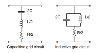 Two element (plus resistance) model for capacitive and inductive metallic grids. These equivalent circuits reproduce the transmission properties of metallic grids in both the and limits.[5]