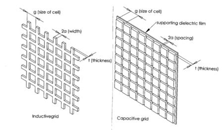 In 1967 Ulrich showed that the optical transmission properties of a metallic mesh can be modeled by considering the mesh to be a simple circuit element on a free space transmission line. To develop the theory of metallic meshes, he focused on the properties of two types of mesh structure: a metallic grid with square openings; and a grid of metallic squares supported on a thin dielectric substrate. Using the transmission line method, he then modeled the behavior of each of these meshes as either lumped inductance (square openings) or a lumped capacitance (free-standing squares). These two types of meshes are commonly referred to as inductive or capacitive meshes.[2][5]