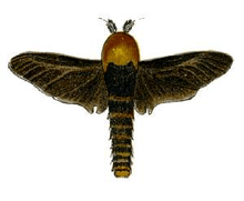 The wingspan is about 30 mm for males. Adult males have black wings, an orange hairy head and a black and orange banded abdomen. Female adults have no wings and remain in the larval case. They are white with a brown head and reach a length of about 30 mm. [2]
