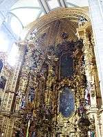 It takes its name from the statues of saintly royalty which form part of its decoration,[7] and is the oldest work in churrigueresque style in Mexico, taking 19 years to complete. At the bottom, from left to right, are six female royal saints: Saint Margaret of Scotland, Helena of Constantinople, Elisabeth of Hungary, Isabel of Portugal, Empress Cunegunda and Edith of Wilton. In the middle of the altar are six canonized kings, four of whom are: Hermenegild a Visigoth martyr, Henry II, Holy Roman Emperor, Edward the Confessor and Casimir of Poland. Above these four are Saints Louis of France and Ferdinand III of Castile. In between these kings an oil painting of the Adoration of the Magi by Juan Rodriguez Juarez shows Jesus as the King of kings. The top portion features a painting of the Assumption of Mary as celestial queen flanked by oval bas reliefs, one of Saint Joseph carrying the infant Jesus and the other of Saint Teresa of Ávila with a quill in her hand and the Holy Spirit above her, inspiring her to write. Above this are figures of Jesus and Mary among sculptures of angels crowned with an image of God, the Father.[15]