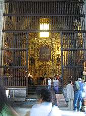 The Altar of the Kings was also the work of Jerónimo Balbás, in Mexican Baroque or Churrigueresque style.[7] It was begun in 1718 by Balbás[13] in cedar, and was gilded and finished by Francico Martínez, debuting in 1737.[5] It is located at the back of the Cathedral, beyond the Altar of Forgiveness and the choir. This altar is 13.75 metres (45.1 ft) wide, 25 metres (82 ft) tall and 7.5 metres (25 ft) deep. Its size and depth gave rise to the nickname la cueva dorada ("the golden cave").