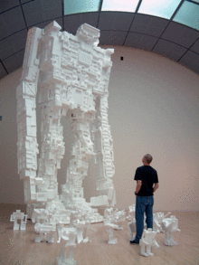 Michael Salter (born 1967)[2] is an American contemporary artist and educator.[3] Salter works in a variety of media, including drawing, painting, digital art, animation, kinetic sculpture,[4][5] and sculptural assemblage.[6] His work often references and subverts the visual language of corporate branding and graphic design,[5] and reflects his desire to, in his words: "sort out the cacophony of visual noise in order to rethink meaning, motive, perception and narrative."[7] His work has been described as postmodern, whimsical,[8] quirky, unsettling,[6] cryptic,[4] and thought-provoking.[5] Salter is perhaps best known for his giant Styrobots - a series of site-specific installations which rise ceiling-high to dominate their space.[5]