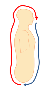 Normally essence or Jing can flow either way through the eight extra meridians or energy pathways in the body, but in the microcosmic orbit meditation exercise Jing is encouraged to flow upwards along the Governor vessel during inhalation and then downwards along the conception vessel returning to the Dantian on the exhalation.[7] This means that energy flows from the Dantian downwards to the base of the spine then up the back along the centre line of the body to the crown of the head, then over the head and down the front centre line of the body and back to the starting point again making a full circle or orbit.[8] This prevents the body's natural essences from becoming depleted as they normally flow downwards from the brain or 'sea of marrow' and are lost during ejaculation or menstruation during the reproductive processes. It is this Jing or essence which is responsible for the reproductive processes in the body which allow the body to rejuvenate itself as well as for the reproductive processes which give rise to offspring, essence is also an important component in the manufacture of qi which can be translated into English as vitality or energy, the primary motive force which is life itself. This raising and lowering Jing through the Microcosmic orbit and returning it to the Dantian purifies the essence and transforms it into Qi or vitality.