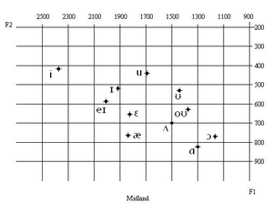 Midland American English is, historically, a regional dialect or super-dialect of American English,[4] and, currently, a related set of English varieties in transition, geographically lying between the traditional Northern and Southern United States.[5] Found in a broad swath of the central United States, its exact regional boundaries and defining features are somewhat debated among linguists due to its pronunciation undergoing rapid changes since the mid-twentieth century. However, these general characteristics of the Midland accent are firmly established: Southern-like fronting of the /oʊ/, /aʊ/, and /ʌ/ vowels occurs towards the center or even front of the mouth;[6] the cot–caught merger is neither fully completed nor fully absent; and short-a tensing evidently occurs strongest before nasal consonants.[7]