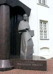 Mikalojus Daukša (other possible spellings include Mikalojus Daugsza, Polish: Mikołaj Dauksza and Mikolay Dowksza;[1] after 1527 – February 16, 1613 in Medininkai) was a Lithuanian and Latin[2] religious writer, translator and a Catholic church official. He is best known as the first among Lithuania's humanists to underline the need to codify and promote the Lithuanian language over Chancery Ruthenian and Polish, which were in use in the Grand Duchy at the time.[3] Daukša's Lithuanian translation of Jacob Ledesma's catechism became the first book in Lithuanian to be published in the Grand Duchy of Lithuania.