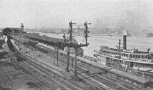 The original Milsons Point station was not in its present location, but on the edge of Sydney Harbour approximately on the site of the present northern pylon of the Sydney Harbour Bridge and the North Sydney Olympic Pool. This location enabled passengers from the North Shore to transfer directly from steam trains to ferries to reach Circular Quay. It opened as the southern terminus of the North Shore railway line on 1 May 1893.[1] when extended from its previous terminus at St Leonards (opened from Hornsby 1 January 1890).[2] The site, squeezed between the rock cliffs and the edge of Sydney Harbour was cramped, with two side platforms, one of which was built on piles partly over the water's edge, and three tracks between, including a centre road.[3] Immediately adjoining it to the west was the colonnaded Milsons Point ferry wharf for the ferry service to Circular Quay in the Sydney central business district and tram terminus for the North Sydney cable tramway (opened 22 May 1886) and subsequently electrified from 11 February 1900.[4][5][6]