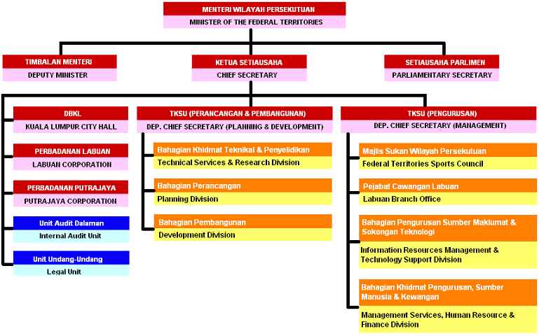 Upper management in the ministry is classified to include the Minister, Deputy Minister, Parliamentary Secretary, Chief Secretary, and the two Deputies Chief Secretary. The Deputies Chief Secretary manage the numerous working divisions of the ministry. For the local agencies of the federal territories, they are under the administration of their respective heads (Mayor for Kuala Lumpur, Chairmen for Putrajaya and Labuan). These agencies are under the supervision of the Chief Secretary.