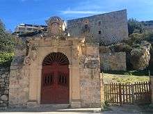 The Mistra Gate is built in the Baroque style, and it is decorated with the coats of arms of Grand Master Manuel Pinto da Fonseca, the Monte di Redenzione, Balì Claudius de Montagne de Lafeuliere and Balì Carlo Maria Olgiati.[2] A farmhouse which was also part of the estate is located close to the gate. In addition, a marker indicating the limits of the property belonging to the Monte di Redenzione can also be found nearby.[3]