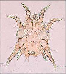 Infestation of the outer skin is typically caused by psoroptic mites. Psoroptes ovis is an example, it infests sheep and cattle. Other common psoroptic mites are in the genera Chorioptes and Otodectes. Psoroptic mites as adults are just large enough to see with the naked eye and can crawl rapidly using long legs. Psoroptes ovis infests the superficial layers of the skin, among the dead cells of the stratum corneum. Irritation of the outer skin by the mite's mouthparts and saliva results in cutaneous hypersensitivity and inflammatory exudation of serum and fresh cells. The mites feed on this exudate.[2] The skin loses its hair at the sites of infestation and large flakes of dried serum and cells accumulate. The mites cause intense pruritus (itching) and the host will groom compulsively and may become severely distressed.[3][4] Depilation (hair loss) may be substantial. Psoroptes ovis infests sheep worldwide and can be a serious welfare and animal production problem, mainly for sheep, but also cattle. Psoroptes cuniculi infests rabbits, mainly on their outer ear. Chorioptes bovis infestations are found on cattle, sheep and horses but do not cause the severe reactions associated with Psoroptes mites. Otedectes cynotis infestations on the outer ear of dogs are a common problem.