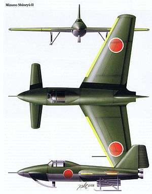 The Mizuno Shinryū/Jinryū (神龍, "Divine Dragon") was a late-World War II Japanese rocket-powered interceptor. While the Jinryū was still in development, Mizuno began to develop an Interceptor which both the Army & Navy air force were in desperate need of to fend off the Boeing B-29 Superfortress. When Japan surrendered to the Allies on the 15 of August, all aircraft that were under development were stopped, including the Jinryū & Shinryū II. The Shinryū II was the second aircraft developed in Japan to use a canard design, after the J7W1.