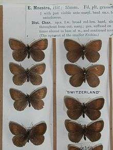Mnestra's ringlet (Erebia mnestra) is a member of the Satyrinae subfamily of Nymphalidae. It is a mountain butterfly found in the Alps of Austria, France, Italy and Switzerland. The Mnestra's ringlet is named for Mnestra, a daughter of Erysichthon, King of Thessaly in Greek mythology.