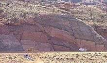 The Moab Fault, near Moab, Utah, United States, is a well exposed and much studied geological fault. The Moab fault is an extensional fault that runs approximately NW-SE, passing to the west of the Arches National Park. It is about 45 km (28 mi) long and has a maximum displacement of about 960 m (3,150 ft).[1] The rocks on the SW side of the fault have been lifted up forming steep cliffs of Triassic Wingate sandstone and Chinle formation.