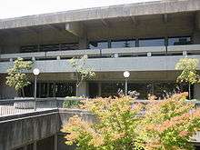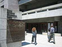 Based on a major donation by university alumnus Stephen M. Silberstein, the university established the Free Speech Movement Cafe in the third floor entryway of Moffitt Library.[2] The Free Speech Movement Cafe commemorates the protests surrounding the Free Speech Movement.[3] A reproduction of what may be considered the most recognizable and iconic photograph that captured the movement, a shot of the key demonstration march where suit-clad students carry the Free Speech banner through the university's Sather Gate in fall 1962,[4] stands now at the entrance to the cafe. The Silberstein gift also helped to underwrite the Free Speech Movement Digital Archive.[5]