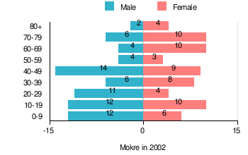 (by age group in 2002)TOTAL 0-9 10-19 20-29 30-39 40-49 50-59 60-69 70-79 80 + I. TOTAL person 135 18 22 15 14 23 7 14 16 6 — of which in % 100 13.3 16.3 11.1 10.4 17 5.2 10.4 11.9 4.4 1. BY SEX A. Males person 71 12 12 11 6 14 4 4 6 2 — of which in % 52.6 8.9 8.9 8.1 4.4 10.4 3 3 4.4 1.5 B. Females person 64 6 10 4 8 9 3 10 10 4 — of which in % 47.4 4.4 7.4 3 5.9 6.7 2.2 7.4 7.4 3