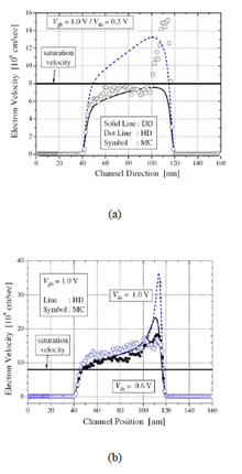 The accuracy of semiclassical models are compared based on the BTE by investigating how they treat the classical velocity overshoot problem, a key short channel effect (SCE) in transistor structures. Essentially, velocity overshoot is a nonlocal effects of scaled devices, which is related to the experimentally observed increase in current drive and transconductance.[5] As the channel length becomes smaller, the velocity is no longer saturated in the high field region, but it overshoots the predicted saturation velocity. The cause of this phenomenon is that the carrier transit time becomes comparable to the energy relaxation time, and therefore the mobile carriers do not have enough time to reach equilibrium with the applied electric field by scattering in the short channel devices.[6] The summary of simulation results (Illinois Tool: MOCA) with DD and HD model is shown in figure beside. In the figure (a), the case when the field is not high enough to cause the velocity overshoot effect in the whole channel region is shown. Note that at such limit, the data from the DD model fit well to the MC model in the non-overshoot region, but the HD model overestimate the velocity in that region. The velocity overshoot is observed only near the drain junction in the MC data and the HD model fits well in that region. From the MC data, it can be noticed that the velocity overshoot effect is abrupt in the high-field region, which is not properly included in the HD model. For high field conditions as shown in the figure (b) the velocity overshoot effect almost all over the channel and the HD results and the MC results are very close in the channel region.