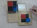 - Boxes with tablets inside. The sides are usually made of wood or plastic. The middle is painted wood or plastic. The only difference between them is the colors in the middle. There are three color boxes. The first has the three primary colors (red, blue, and yellow). The second has 12 different colors. The third box has nine colors, but in different grades from light to dark.