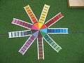 The child can do a variety of exercises with these materials, including matching them with the cylinder blocks, stacking them on top of each other to form a tower, and arranging them in size or different patterns. When the yellow, red, and green cylinders are placed on top of each other, they all are the same height.[1]