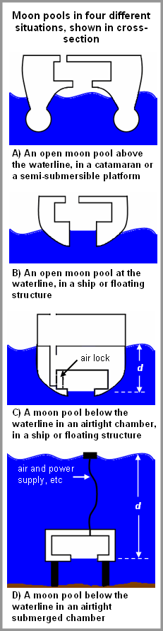 In a drilling platform, the moon pool is usually above sea level, and is open to the air above and below. The research vessel Western Flyer (pictured) also has a moon pool above the waterline, which its SWATH (twin-hull) design allows. See part A of the diagram. The chamber above the moon pool is also connected to the open air via staircasewells and passages.