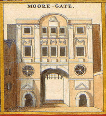 Little Moorgate was a gate opposite Little Winchester Street leading into Moorfields. It had been demolished by 1755, but gave its name to a street [1] that was later removed for the building of a railway.
