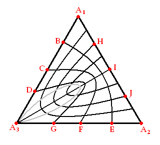 The Morin surface has a quadruple point through which passes its axis of symmetry. This quadruple point is the starting point and the end point of six lines of double points. Each of the quarter sections is bounded by three of these lines of double points, so that each quarter section is homeomorphic to a triangle. Section East is now shown schematically: