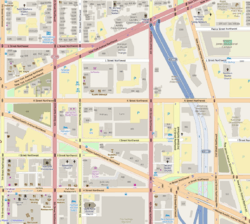 Commercial development increased in the neighborhood in the 1910s and 1920s. Increased traffic on New York Avenue resulted in the addition of gas stations, garages and car repair shops, many of which replaced residential buildings. By 1930, Northern Liberty Market (called Center Market at the time) was under threat of closing and demolition. A new and modern building for vendors was built on the opposite corner. As the number of commercial and industrial businesses increased, many residents moved elsewhere. Many homes became boarding houses for poor residents, a trend that significantly increased following World War II. In 1946, a fire destroyed much of Center Market, resulting in many local businesses supported by the market to close or move to other parts of the city. The streetcar on New York Avenue was removed in 1949 and many of the residential buildings along that road were demolished and replaced with parking lots. In the 1960s, a large portion of the neighborhood's eastern section, including the remaining portion of Douglas Row, was demolished to make room for Interstate 395. During the 1968 riots that followed the assassination of Martin Luther King, Jr., several buildings on the west side of Mount Vernon Triangle were burned.[3] By the 1980s, much of the neighborhood was decrepit, consisted of large parking lots and had become a haven for prostitutes and drug dealers.[4][5][6]