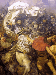 According to the Polish chronicler Jan Długosz, Mszczuj was part of the third Rota, a unit of cavalry of the royal household under the leadership of Andrzej Ciołek from Żelechowo and Jan Odrowąż from Sprowy.[1] Długosz relates that Mszczuj was the knight who defeated and killed the Grand Master of the Order, Ulrich von Jungingen during the Battle of Grunwald. Długosz offers two pieces of evidence for this.[1] First, Mszczuj's squire, Jurga, acquired and handed over a valuable reliquary with holy relics that had previously belonged to von Jungingen, as well as the Grand Master's battle cloak.[2] Second, the locating of the Grand Master's body was made possible thanks to the directions given by Mszczuj, which indicates that the two knights definitely engaged each other on the field of battle.[3]