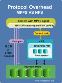 MPFS consists of an agent on the client system and a compatible NAS storage system. The client agent splits the data and meta data for the file being requested. This is done using an FMP (File Mapping Protocol). Requests for the data and its location are sent over conventional NFS to the NAS system. Block data is sent and retrieved directly from the storage device via iSCSI or Fibre Channel. Retrieving data directly from the storage device increases performance by eliminating the file system and protocol overhead associated with NFS or SMB.