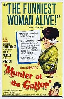 Murder at the Gallop (1963) is the second of four Miss Marple films made by Metro-Goldwyn-Mayer.[1] It was based on the novel After the Funeral by Agatha Christie, and starred Margaret Rutherford as Miss Jane Marple, Charles "Bud" Tingwell as Inspector Craddock and Stringer Davis (Rutherford's real-life husband) as Jane Marple's friend Mr. Stringer.[2]