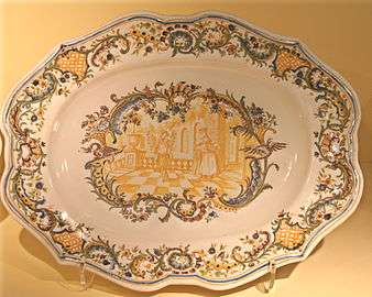 Joseph Fauchier (d. 1751) who learned his trade in Clerissy's factory set up his own works in Marseille in 1710. His family controlled this factory until 1789.[9] Fauchier started to make statues, and specialized in faiense decorated with flowers in natural arrangements.[9] At the beginning of the production the work used decorations "à la Berain." Rouen-style pieces were also produced. Subsequently garlands or wreaths of foliage surrounding landscapes were used. The factory produced polychrome landscape of the "Moustiers" style and parts in the "Chinese" style.