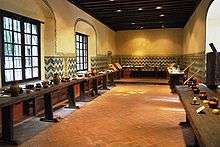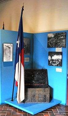 The Mexican Army dislocated the monks living here during the Mexican-American War in order to defend Mexico City from the invading U.S. Army. The Mexicans fortified the building, which included building the parapet.[4] At the time, the complex was far outside the city limits. On 20 August 1847, Battle of Churubusco was fought. When the Mexicans ran out of ammunition, the battle turned to hand-to-hand fighting. When the Mexicans were defeated U.S. General David Twiggs asked General Pedro María de Anaya to surrender his ammunition. The reported response of Anaya is “If there was any, you wouldn’t be here.”[2] This is also the site where Saint Patrick's Battalion, an Irish regiment originally aligned the U.S., switched sides and fought with the Mexicans to defend Mexico City. A plaque honoring them is placed at the main entrance.[1] In 1869, President Benito Juárez declared the site a national monument in honor of the battle,[3] which was reaffirmed in 1933.[4] However, this did not turn it into a museum. From 1876 to 1914, it served as a military hospital, specializing in contagious diseases. In the 1920s, it was an art school, and from 1920 to 1960 it was a depot.[2] In the 1960s and 1970s, this building was known unofficially as the Transport Museum as a large number of old vehicles were stored there. This collection was eventually sent to Zacatecas in 1985.[3]