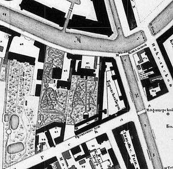 The next owner of the site with all the buildings and the garden was M. A. Kusovnikov, a merchant. In the 1804 city register the plot was placed in the fourth Admiralty division of the first block. The plot was numbered 46 and valued at 50,000 rubles. By the time of the 1822 register, the estate was owned by E. V. Kusovnikova, and was valued at 65,000 rubles.[7] The house appears in Friedrich von Schubert’s 1828 plan of the city, its appearance having altered slightly after the construction of an annex near the Moyka and a building along the left border of the plot of land as seen from the Moyka river. This building extended nearly up to the end of the plot and abutted the buildings of the Lithuanian castle. Two buildings parallel to each other stretched along Ofitserskaya ulitza (Officers’ Street), where building 31 is now located. By 1828 that part of the estate was owned by the provisioning department of the Ministry of War, which remained its owner until 1842. In 1834 in accordance with E.V. Kusovnikova’s will her granddaughter Yelena Petrovna Varentzova became the owner of the estate.[8][9] That year street numeration was introduced, and the plot was designated as number 95 on the Moyka embankment.